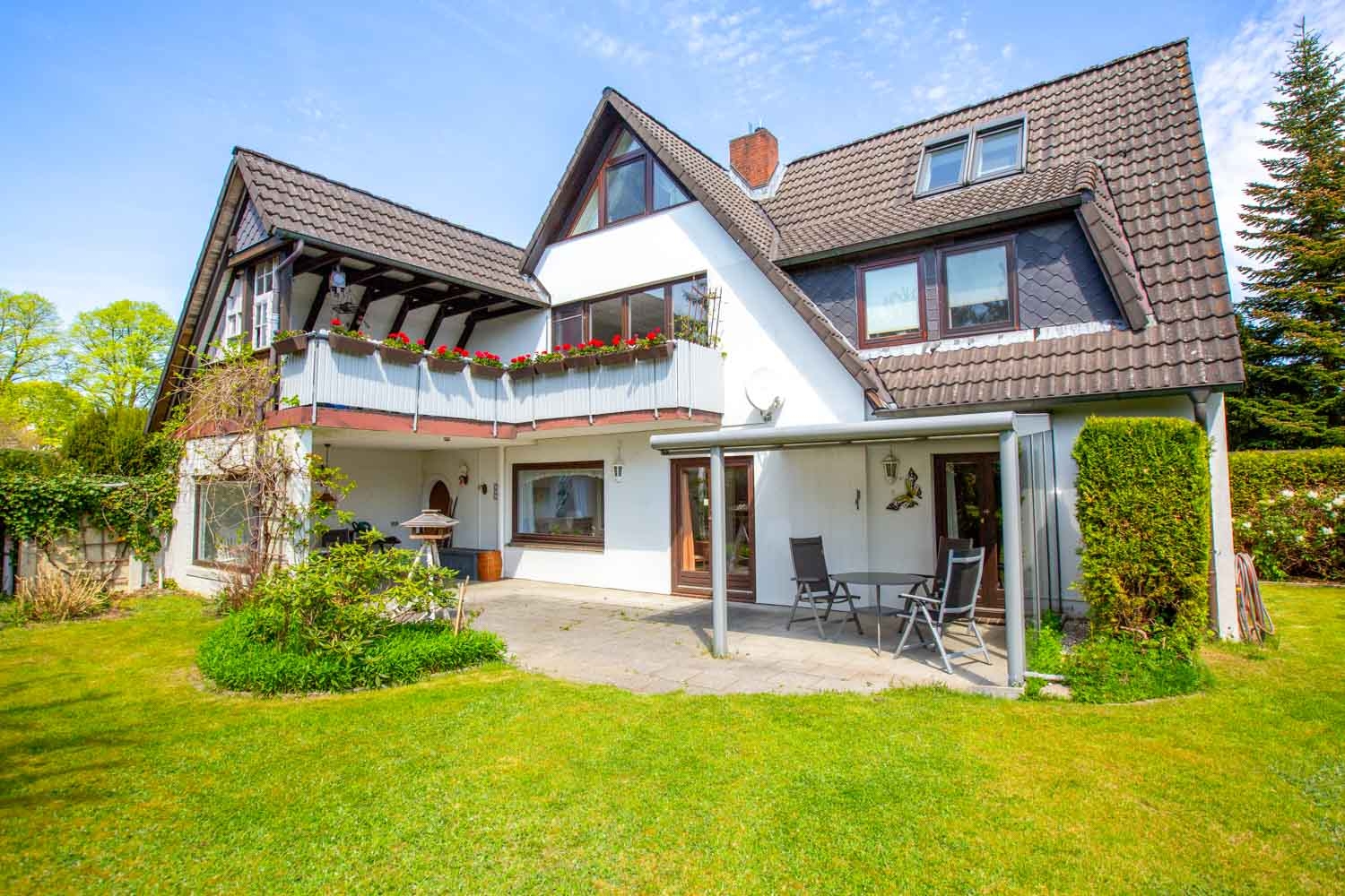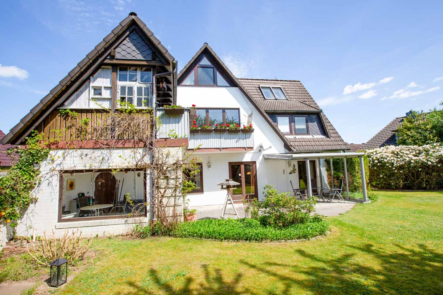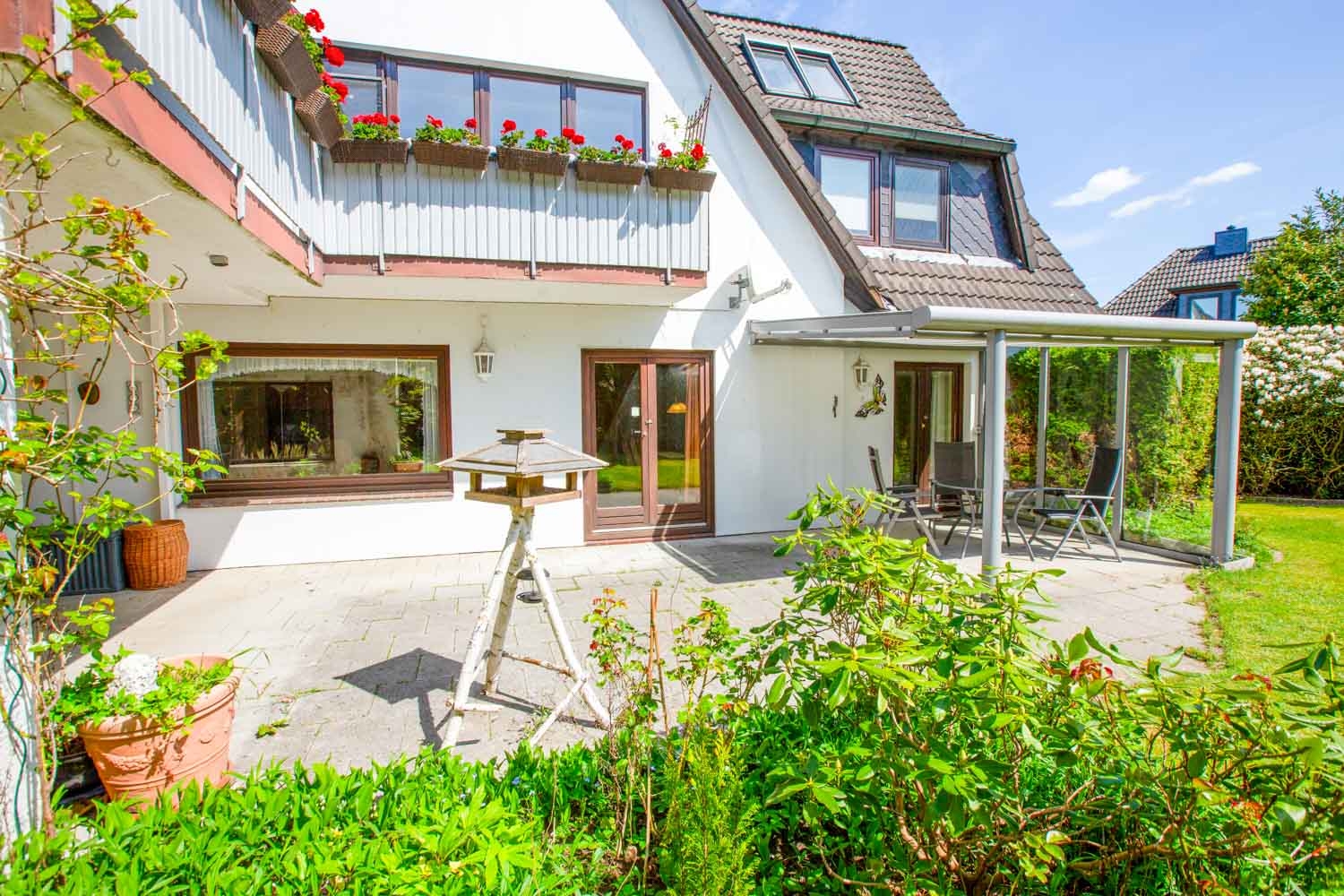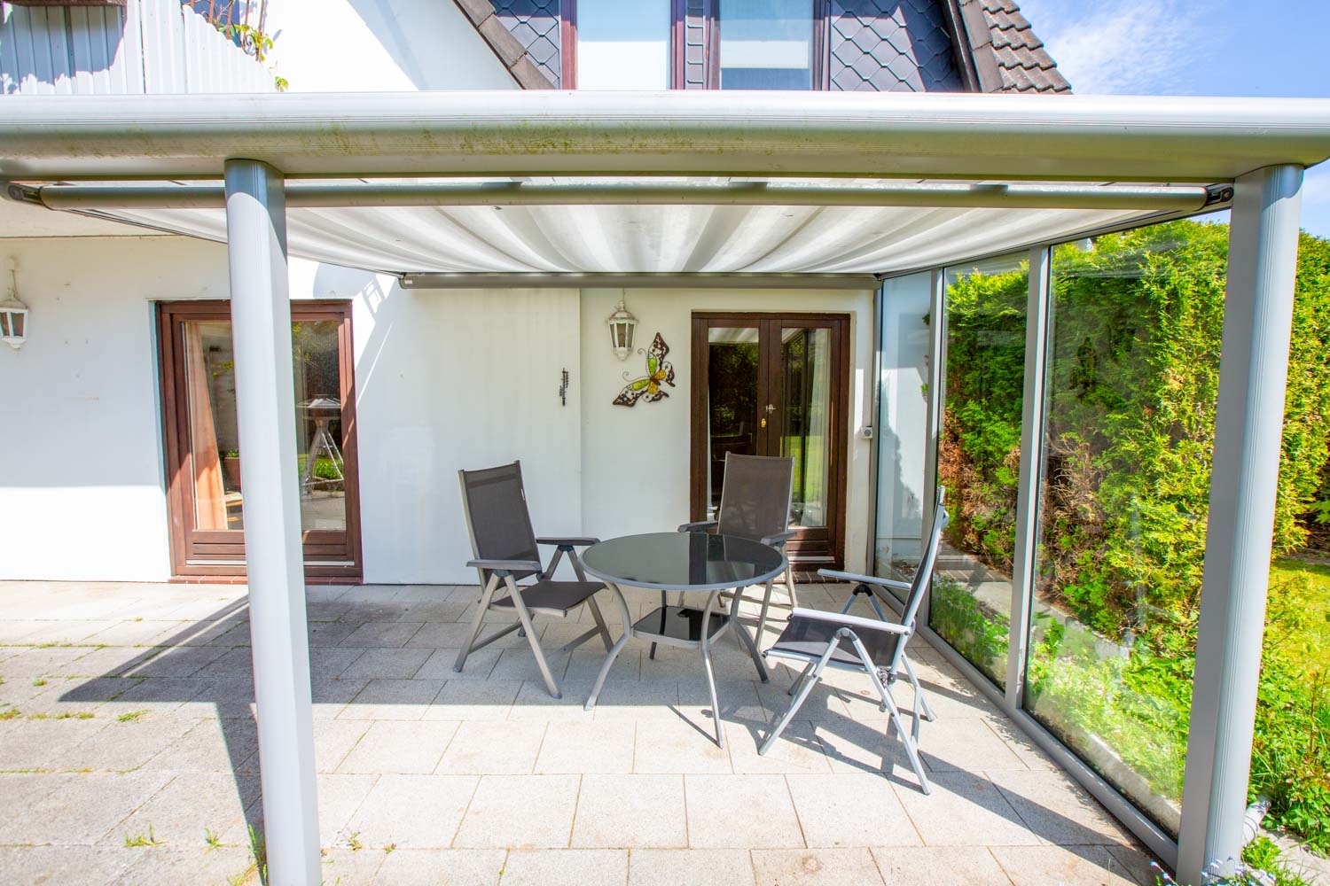 Die große Terrasse ist auf der einen Seite überdacht und lädt zum Verweilen ein. Auf der anderen Seite befindet sich eine Glasüberdachung. Hier können Sie die Sonne genießen und mit Ihren Lieben schöne Stunden draußen verbringen.