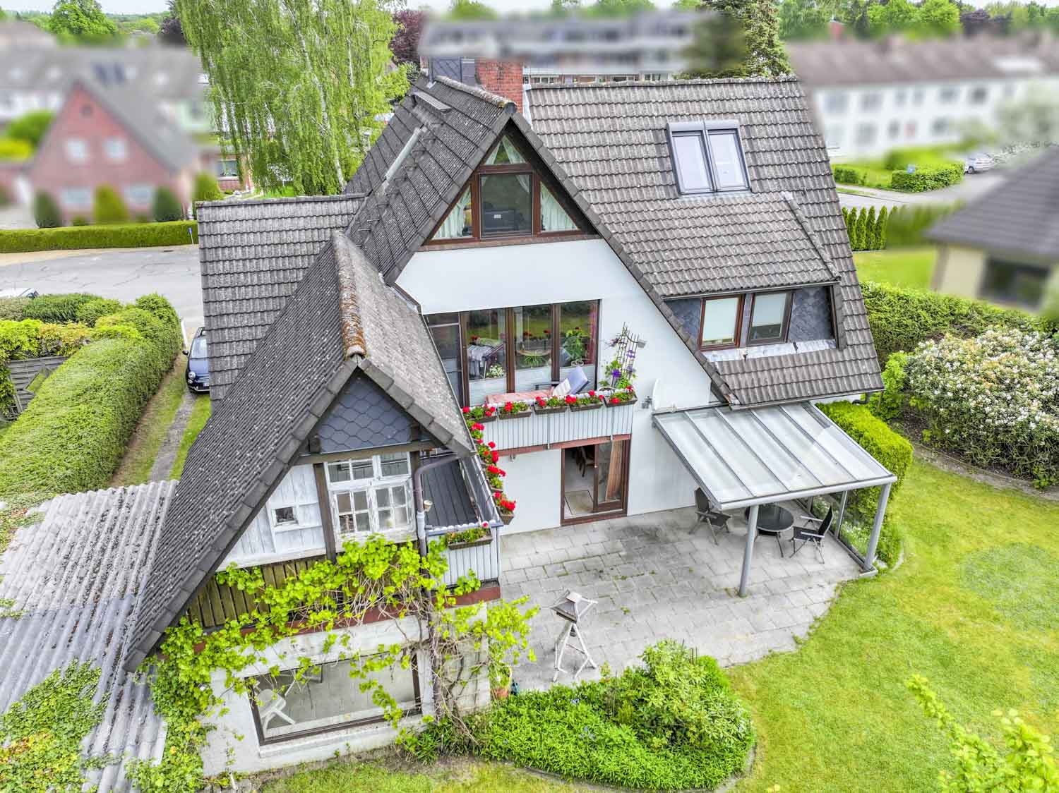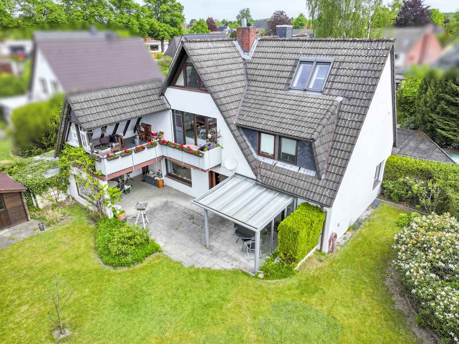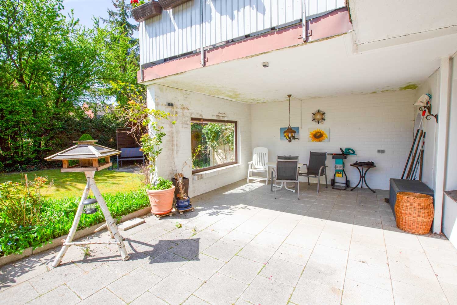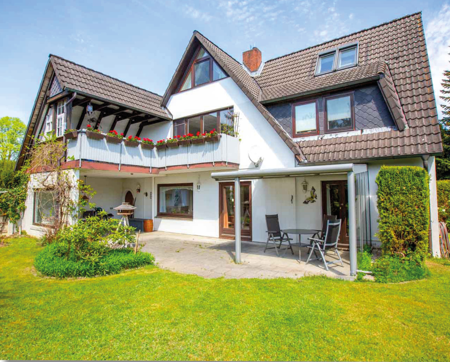 Die große Terrasse ist auf der einen Seite überdacht und lädt zum Verweilen ein. Auf der anderen Seite befindet sich eine Glasüberdachung. Hier können Sie die Sonne genießen und mit Ihren Lieben schöne Stunden draußen verbringen.