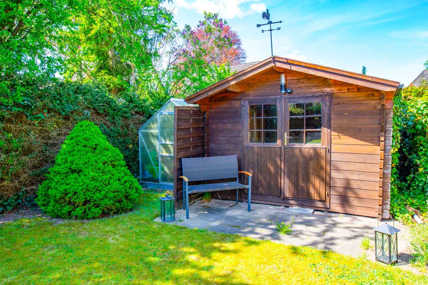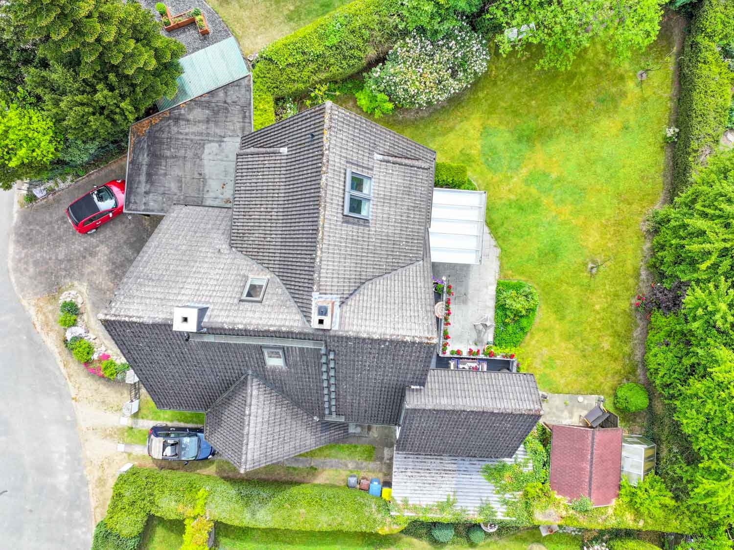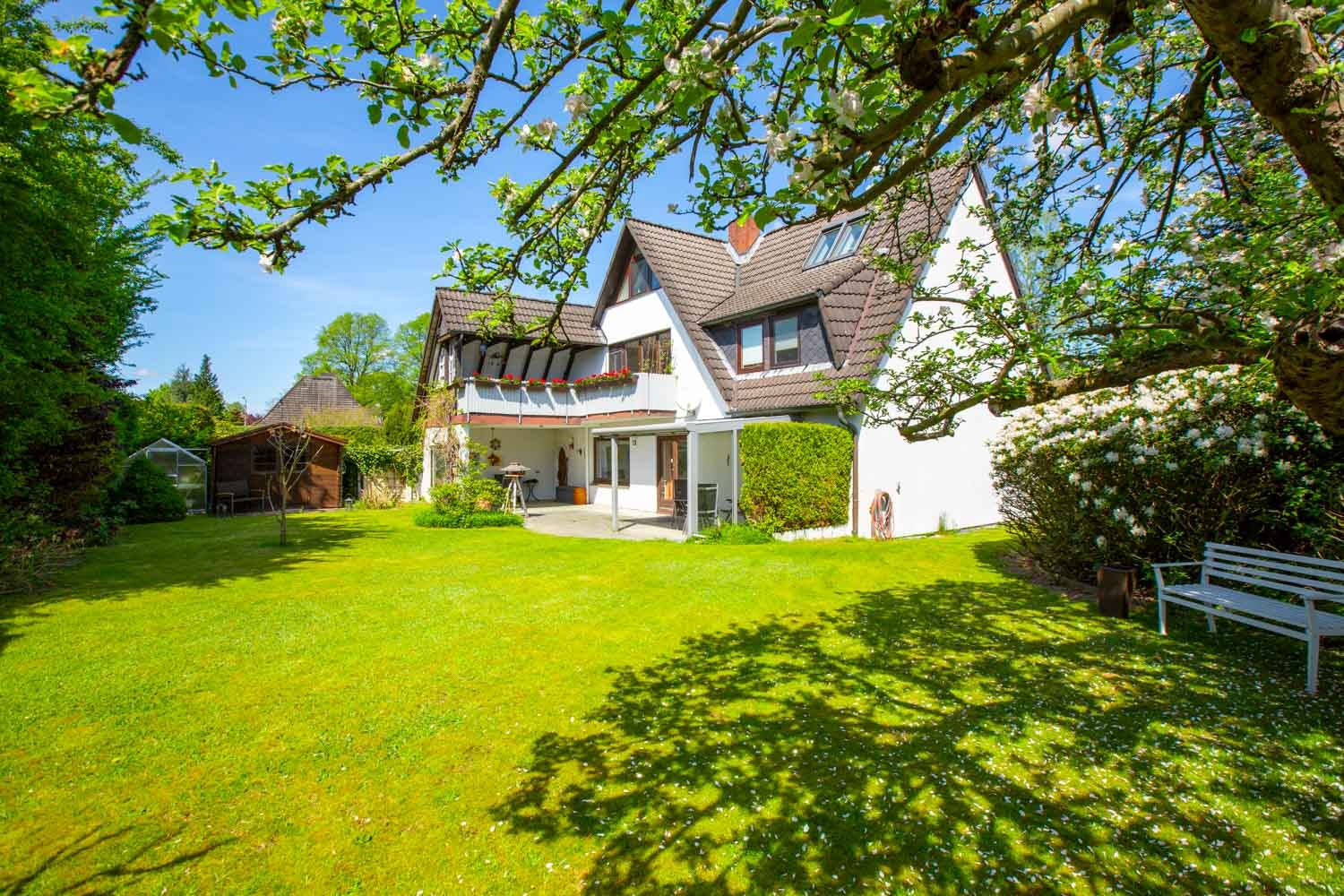 Der schöne Garten ist pflegeleicht mit viel Grünfläche, verschiedenen Blumenoasen und bietet zudem auch genügend Platz für Hund und Kind.