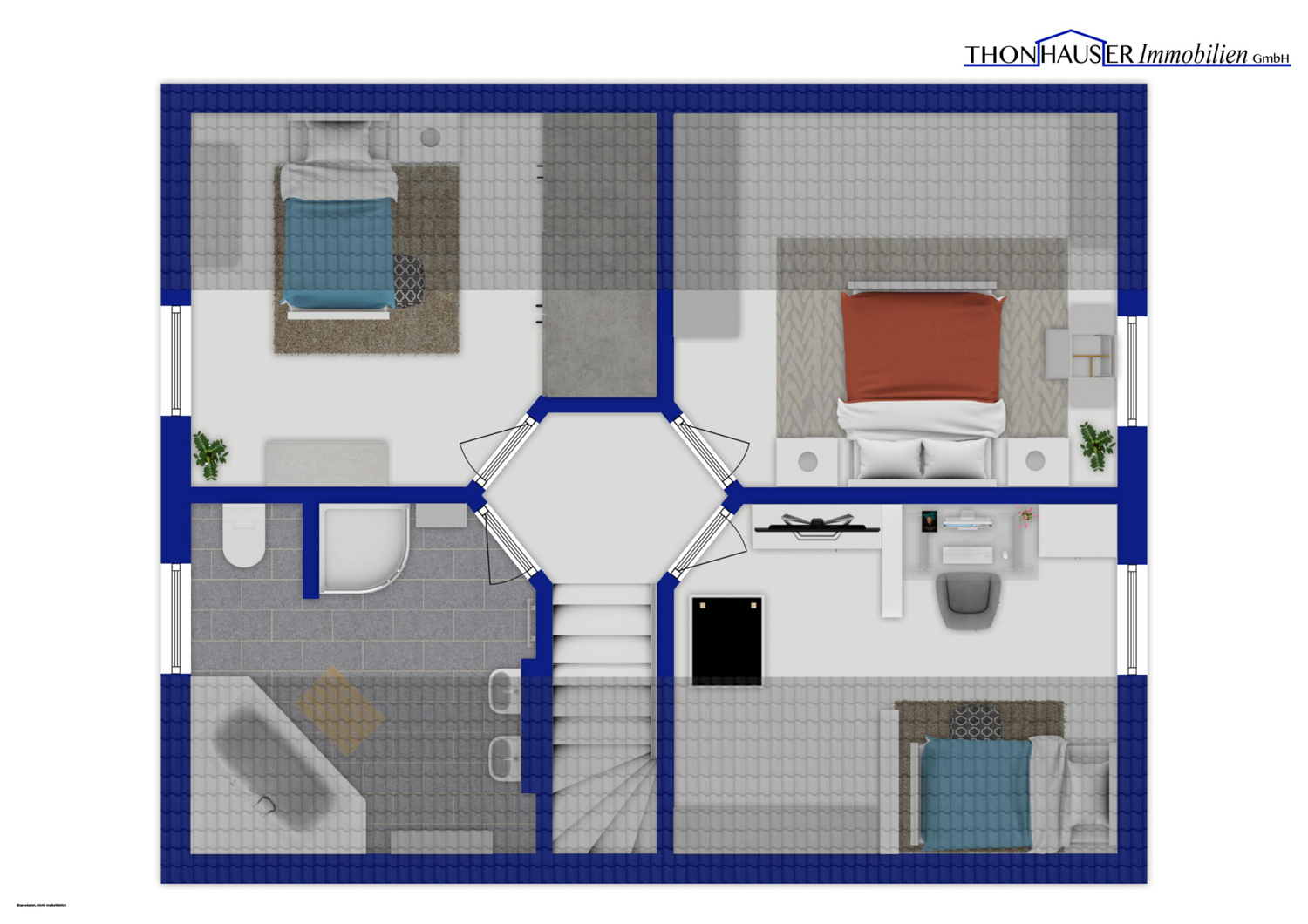 Über die moderne Treppe gelangen Sie ins Obergeschoss. Dort befinden sich derzeit ein Schlafzimmer, zwei Kinderzimmer sowie ein modernes Badezimmer. Dieses ist mit zeitlosen Fliesen, einer Dusche, Badewanne, Toilette und einem Doppelwaschtisch ausgestattet. Zusätzlich sorgt ein ausgebauter Spitzboden für ausreichend Stauraum.